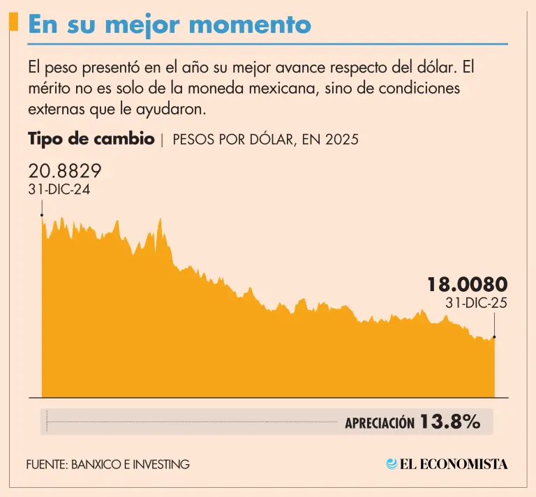 La cotización del peso, frente al dólar, terminó el 2025 con una apreciación del 13.77 por ciento. Lo anterior representó el mejor resultado de la divisa mexicana frente a la moneda de Estados Unidos en 30 años.